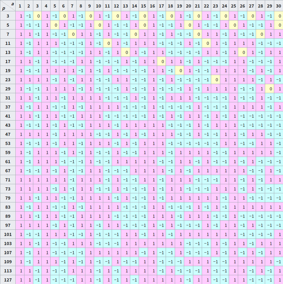 下表为部分勒让德符号的值