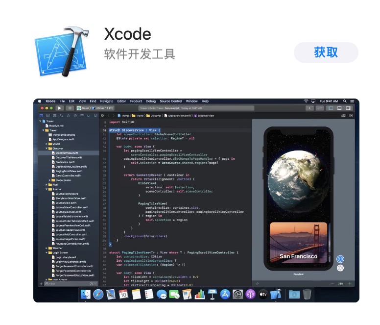 打开苹果电脑自带的 App Store(或者尝试 快捷链接)下载 Xcode。点击获取,然后输入苹果账号密码开始下载安装。