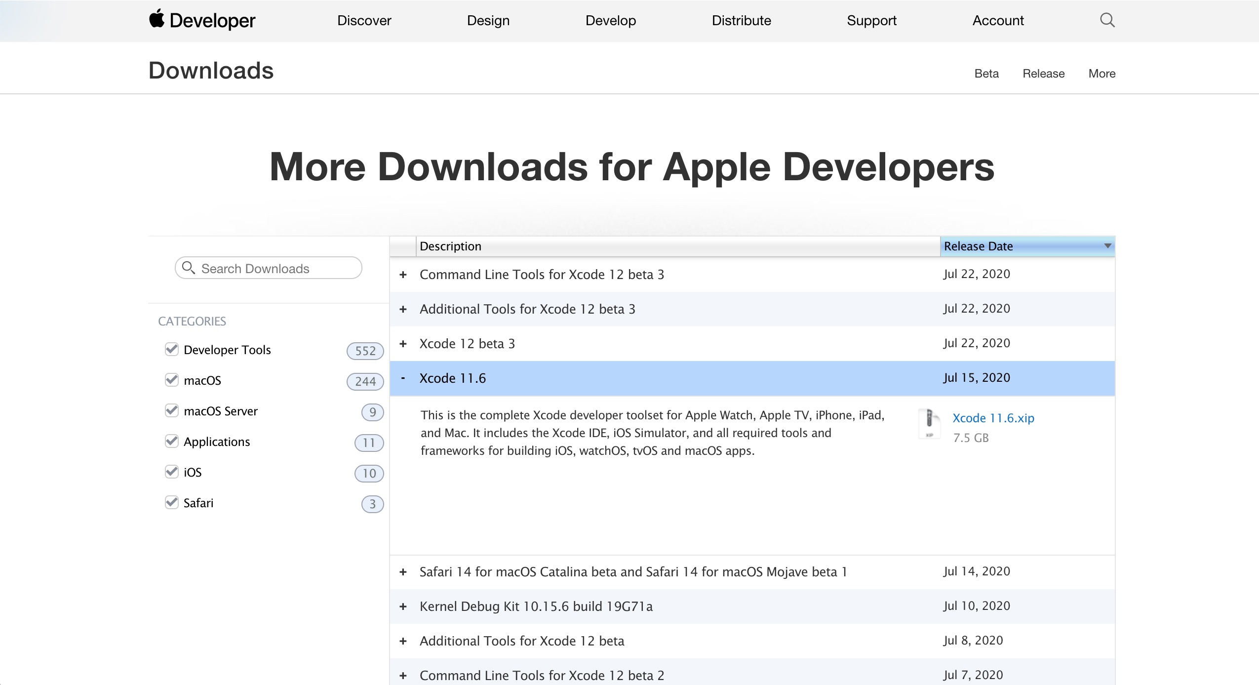 访问 苹果开发者下载页面,用苹果账号登录,然后找到 Xcode 最新的稳定版本安装包(即不含 Beta 的最新版本,此处为 11.6):