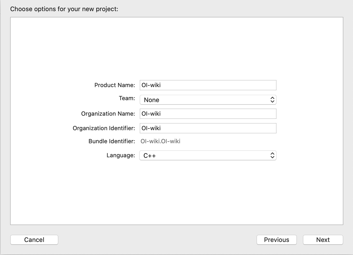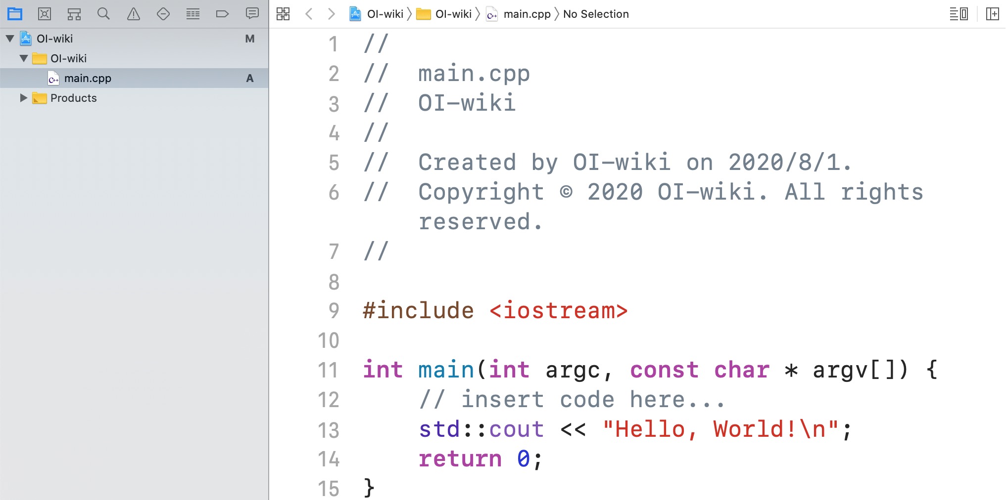 项目的目录可以根据需要选择。创建完毕后,Xcode 会自动打开这个项目,并自动创建一个 main 文件(C 语言的后缀为 .c,C++ 语言的后缀为 .cpp)。