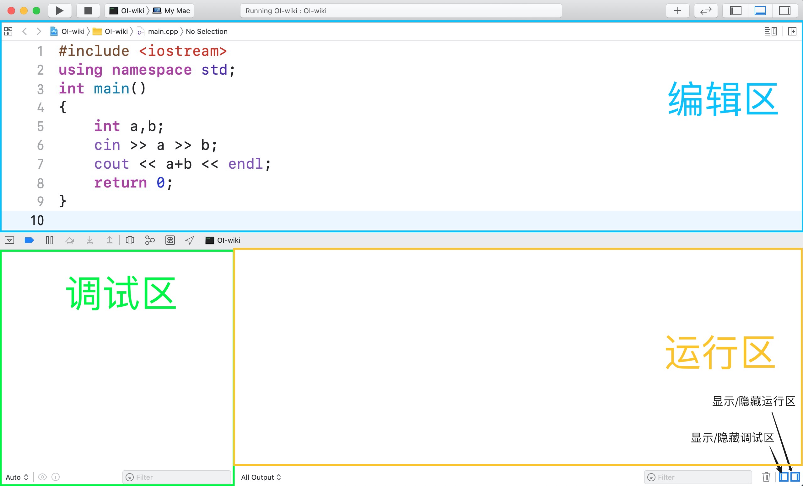一般来说我们只使用【编辑区】和【运行区】。若程序有输入,那么在【运行区】中进行输入之后,就可以得到输出。界面呈现效果:
